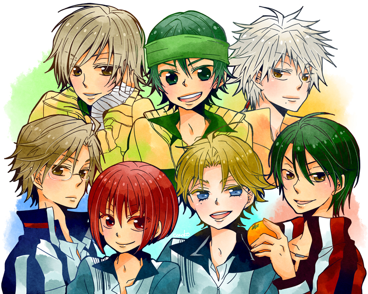 左上から白石、ユウジ、仁王、左下から手塚、岳人、跡部、リョーガ。